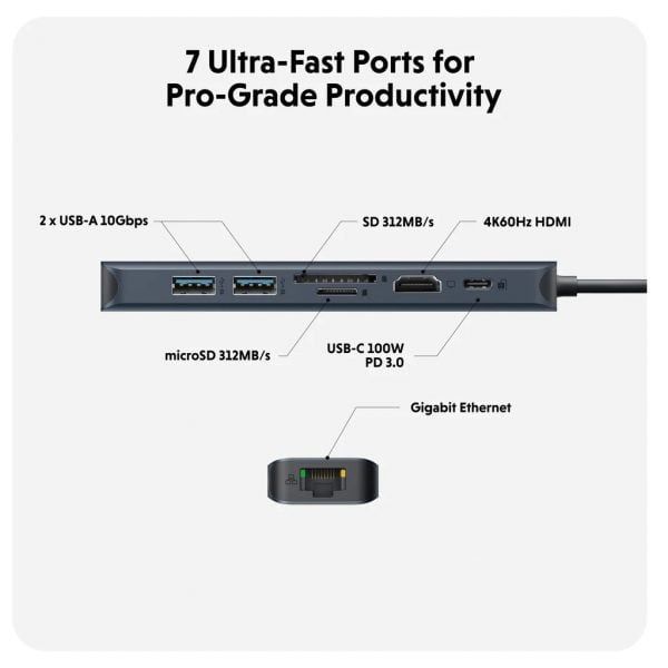 Giới thiệu HyperDrive® Next 7 Port USB-C Hub – giải pháp kết nối tối ưu cho những người sáng tạo, biên tập viên, nhiếp ảnh gia và hơn thế nữa. Với khả năng hỗ trợ màn hình 4K60Hz mở rộng cho Mac, PC và Chromebook, 7 cổng siêu nhanh và truyền dữ liệu nhanh như chớp, hãy giải phóng tiềm năng sáng tạo của bạn ở bất cứ đâu. Trải nghiệm tốc độ truyền tệp nhanh gấp 2 lần bằng cổng USB 10Gbps và tốc độ truyền ảnh và video nhanh gấp 3 lần với SD 4.0. Sạc thiết bị của bạn bằng cổng thông qua nguồn PD 100W và đưa ra lựa chọn bền vững bảo vệ môi trường với EcoSmart™.