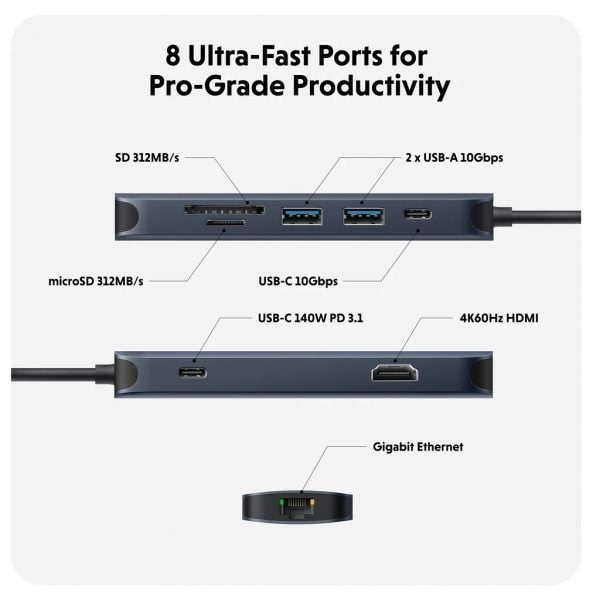 Giới thiệu HyperDrive® Next 8 Port USB-C Hub – giải pháp kết nối tối ưu cho những người sáng tạo, biên tập viên, nhiếp ảnh gia và hơn thế nữa. Với khả năng hỗ trợ màn hình 4K60Hz mở rộng cho Mac, PC và Chromebook, 8 cổng siêu nhanh và truyền dữ liệu nhanh như chớp, hãy giải phóng tiềm năng sáng tạo của bạn ở bất cứ đâu. Trải nghiệm tốc độ truyền tệp nhanh gấp 2 lần bằng cổng USB 10Gbps và tốc độ truyền ảnh và video nhanh gấp 3 lần với microSD và SD 4.0. Lợi ích từ việc tăng công suất sạc lên 40% với cổng nguồn PD 3.1 140W, đảm bảo sạc hiệu quả. Đưa ra lựa chọn bền vững với EcoSmart™.