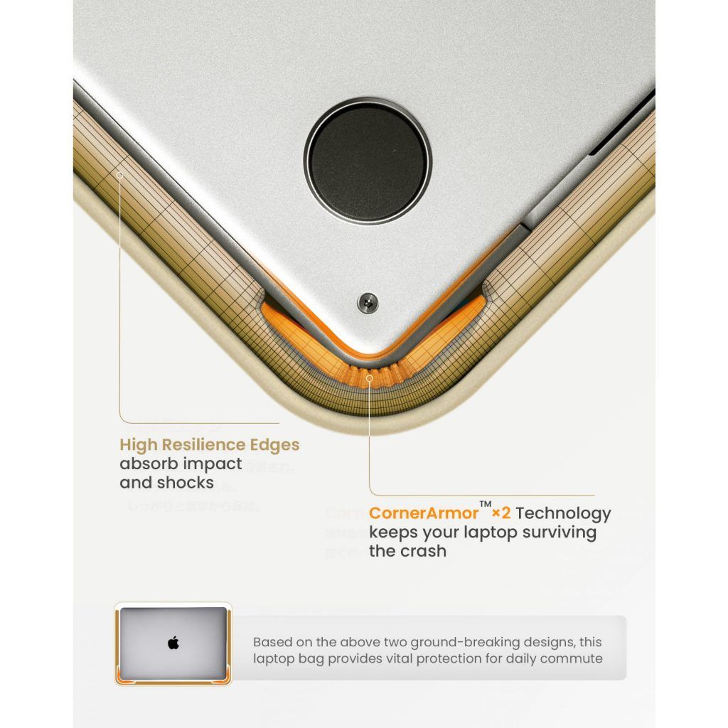 Thiết kế ứng dụng công nghệ sáng chế của Hoa Kỳ [CornerArmor] ở các góc dưới cùng giúp bảo vệ máy tính của bạn khỏi các tai nạn như một túi khí ô tô. Lớp lót lông cừu mềm mại với đệm dày ở ngăn chính giúp bảo vệ máy tính khỏi trầy xước và va đập hàng ngày. Vỏ này cung cấp khả năng bảo vệ mạnh mẽ cho các vật dụng cần thiết hàng ngày trong khi vẫn làm nổi bật lên các đường nét tối giản thanh lịch