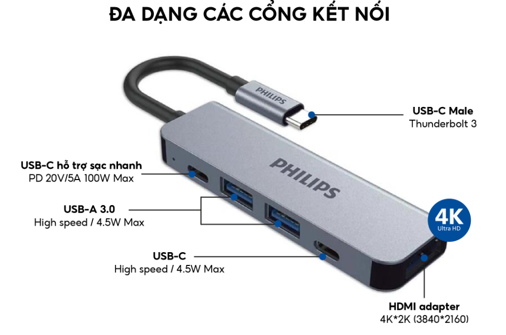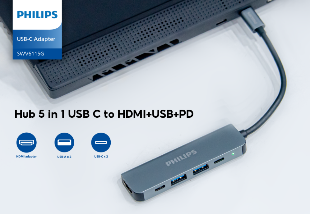 Hub chuyển đổi Philips 5 in 1 USB C to HDMI+USB+PD đa năng, hiệu suất vượt trội