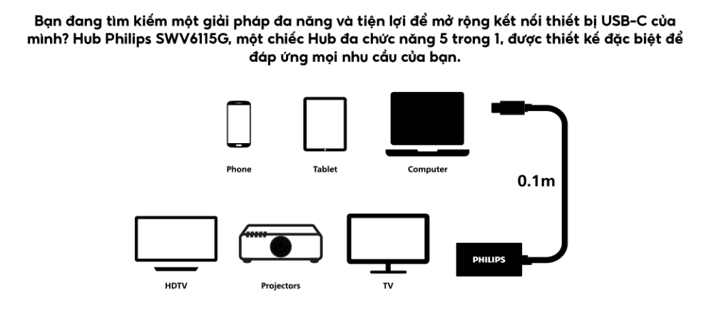 Với Hub Philips SWV6115G 5 in 1, bạn sẽ không còn phải lo lắng về việc kết nối thiết bị của mình với các màn hình lớn hay các thiết bị ngoại vi. Sản phẩm này sẽ mang đến sự tiện lợi, đa dạng, hiệu suất vượt trội và chắc chắn sẽ là một trợ thủ đắc lực đảm bảo tối ưu công việc của bạn.