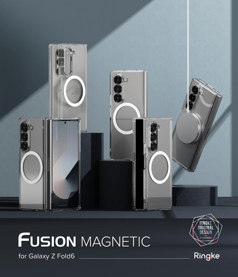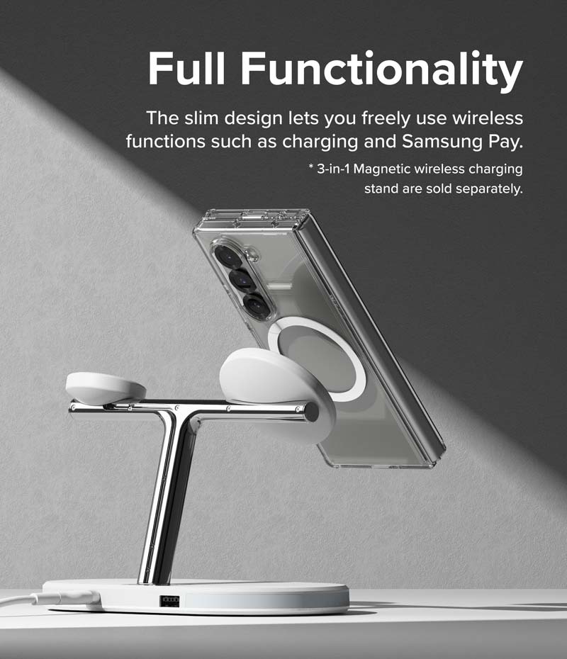 Ốp lưng Samsung Galaxy Z Fold 6 RINGKE Fusion Magnetic có thiết kế trong suốt và kết nối phần trên và phần dưới ốp lưng, giúp giữ nguyên vị trí trong khi mở và đóng thiết bị. Ốp lưng hỗ trợ sạc không dây MagSafe với vòng tròn nam châm tinh tế phía sau mặt ốp.